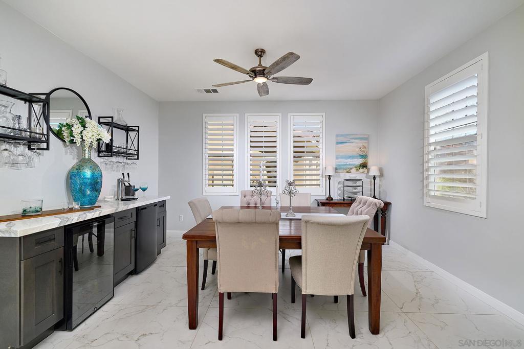 Located within the highly desirable community of 53 Melrose, this extensively remodeled residence offers elevated design, modern functionality, and effortless indoor-outdoor living. A refined approach welcomes you with Italian pavers, a tranquil fountain feature, and thoughtfully designed, low-maintenance landscaping. Inside, the home feels fresh and cohesive, with a recently painted interior and Spanish porcelain flooring spanning the main level. The family room is anchored by a dramatic floor-to-ceiling marble fireplace. The kitchen has been curated for both everyday living and elevated entertaining. Outfitted with Samsung black stainless smart appliances, a farmhouse sink, custom cabinetry, Brazilian Cristallo Quartzite countertops, a Kohler touch-activated faucet, and a generous island, the space is as functional as it is striking. Just beyond, the front living area features a custom bar with a two-tap kegerator, dual-zone wine refrigerator, and matching Cristallo Quartzite surfaces — an ideal setting for hosting with ease. Upstairs, all three bedrooms are en-suite, providing comfort and privacy for family or guests, along with a versatile loft space suited for a home office, media room, or secondary lounge. The primary suite is a true retreat, complete with porcelain marble flooring, freestanding glass and stone sinks, a soaking tub, frameless glass shower with custom mosaic detailing, and a tailored closet system designed for optimal organization. New ceiling fans throughout the bedrooms and main living areas enhance comfort year-round. See supp. Even the powder bath has been thoughtfully updated with refined finishes and modern lighting. The backyard offers a peaceful extension of the home, featuring an Italian porcelain paver patio, artificial turf, mature fruit trees, and roses — a private, low-maintenance setting ideal for quiet mornings or evening gatherings. Additional upgrades include a two-car attached garage with a 50-amp EV charging outlet, newer garage door system, extended driveway with ample parking, Nest thermostat, and a newer 50-gallon high-efficiency water heater. Set in a prime North County location in a top-rated school district, near acclaimed dining, shopping, scenic trails, and the area’s renowned beaches!